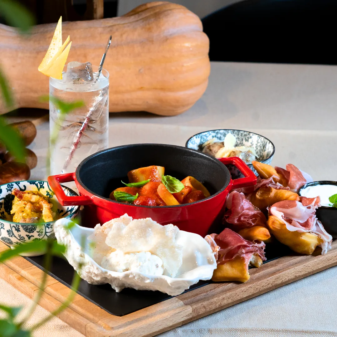 Il nostro Aperi-Sì è un’esperienza completa — un tagliere di specialità regionali, un calice selezionato o un drink premium, il tutto a partire da 20 euro.